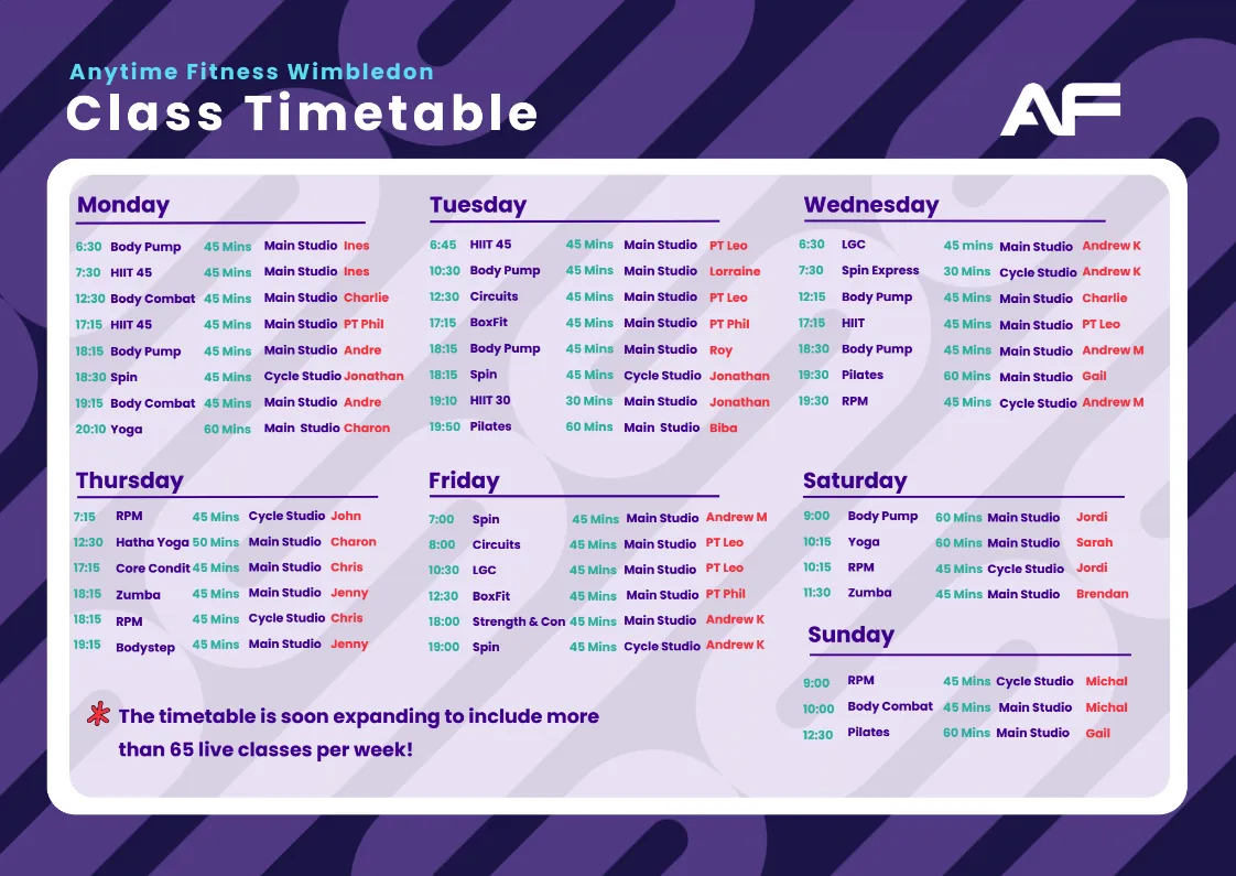 At Anytime Fitness Wimbledon our Timetable will be packed with an awesome mix of classes delivered by our rock star instructors!